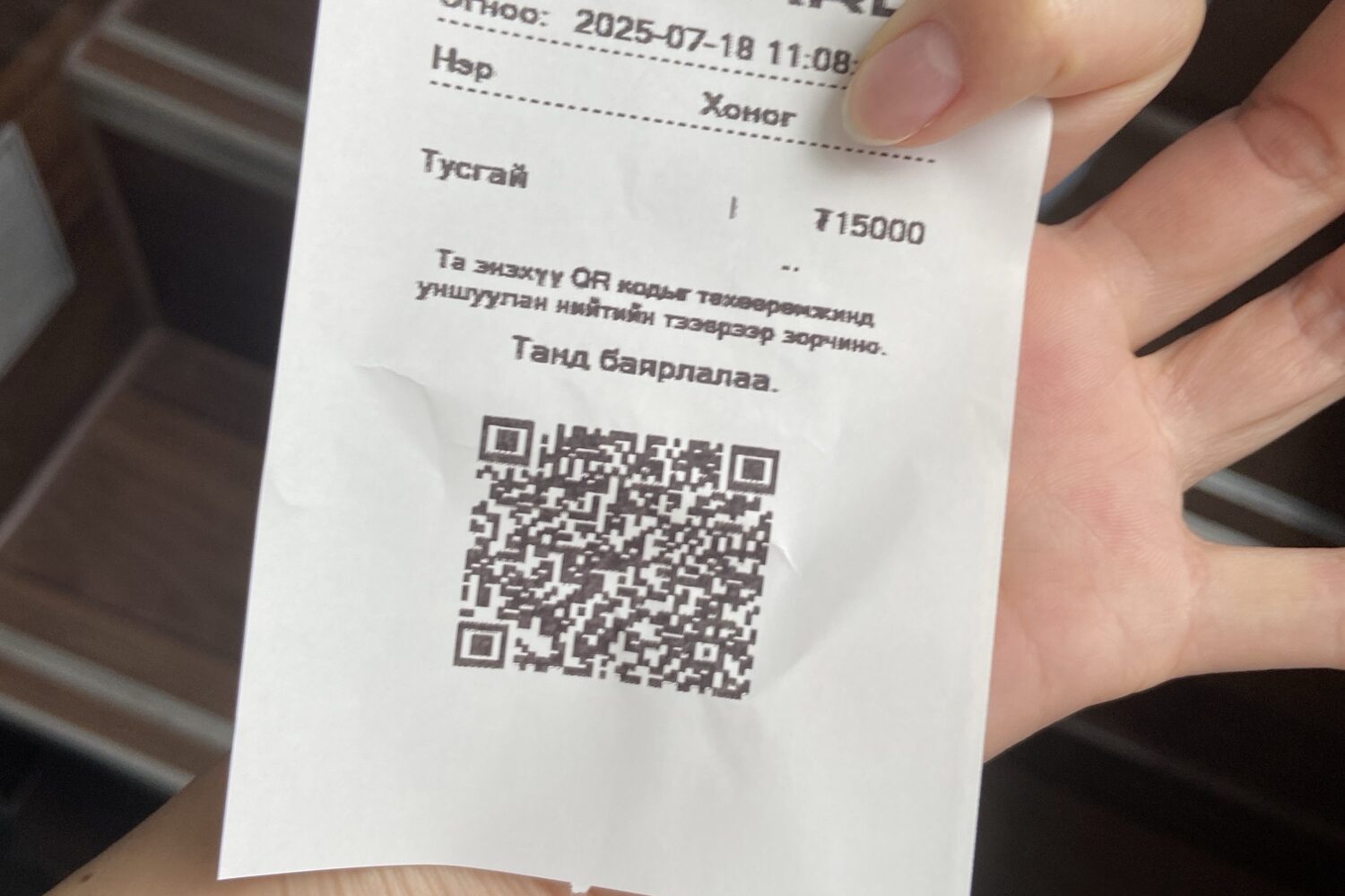 当時のレートが1トゥグルク=0.0414円付近だったので621円。安いです!!タクシーだと約6,000〜8,000円かかるそうなので、かなり節約になります。QRコードを運転手に見せて乗り込みます。