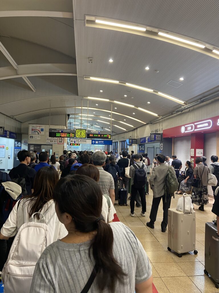 自由席1号車の待機列に着いたのは出発の約20分前。前から4番目に並べて、確実に座れる場所を確保できたので安心です。