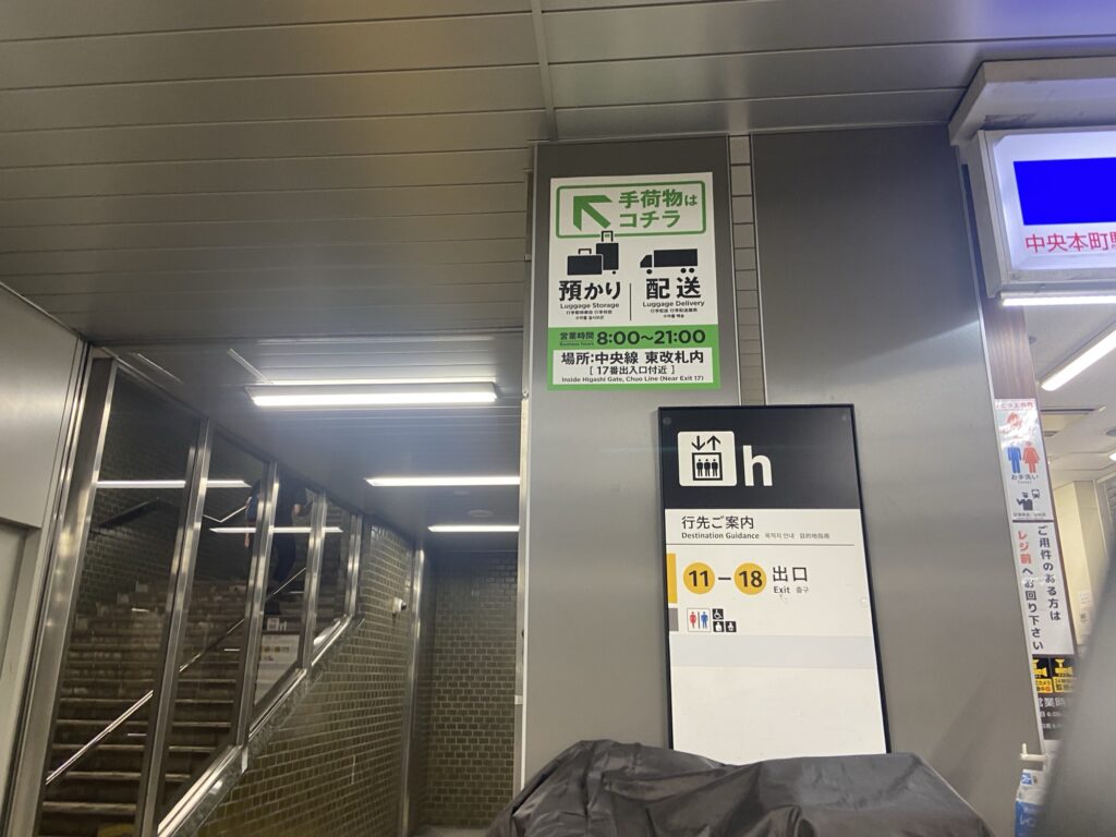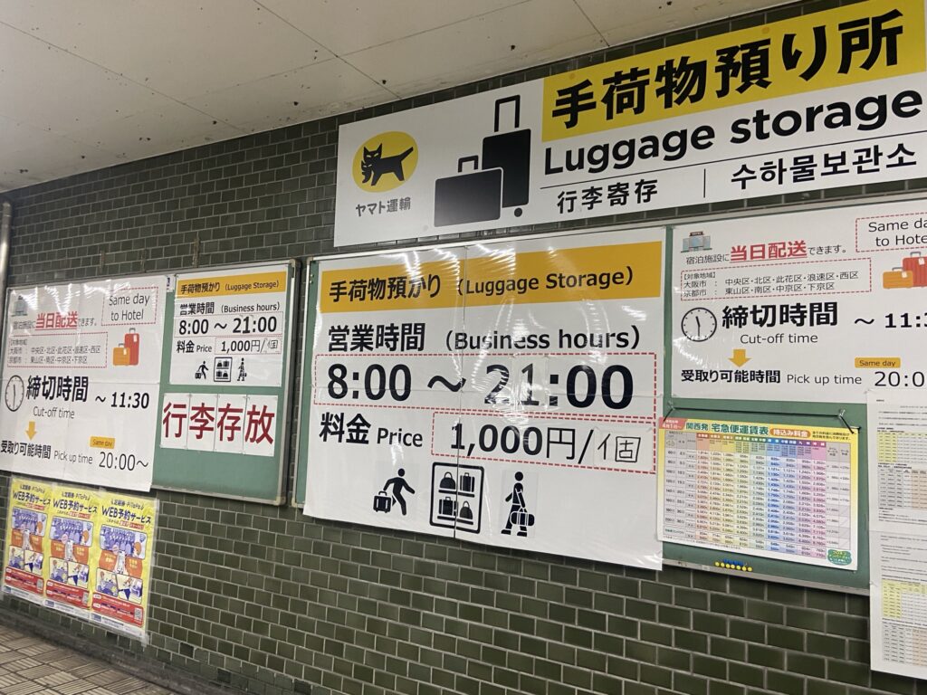 中央線、東改札の17番出口付近にヤマト管轄の荷物預かりサービスがあります。御堂筋線に乗り換える際に掲示を見かけ、2日目は朝にこちらで荷物を預けてから万博に向かいました。