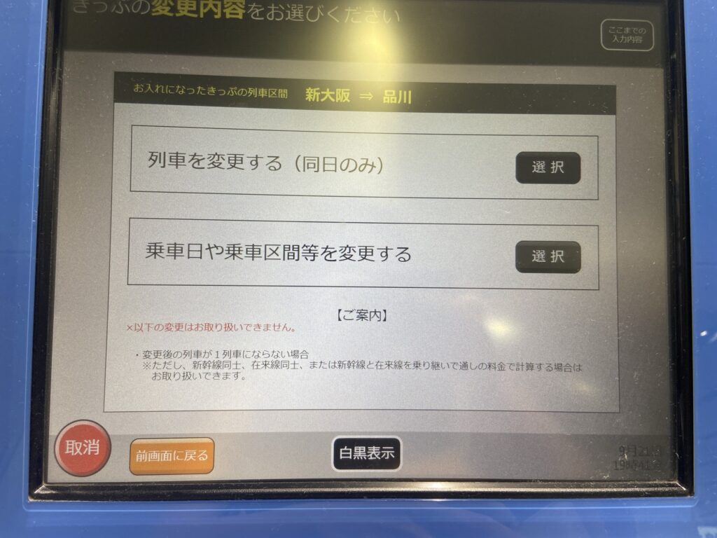 私の場合、紙の切符だったので改札横の券売機で変更しました。