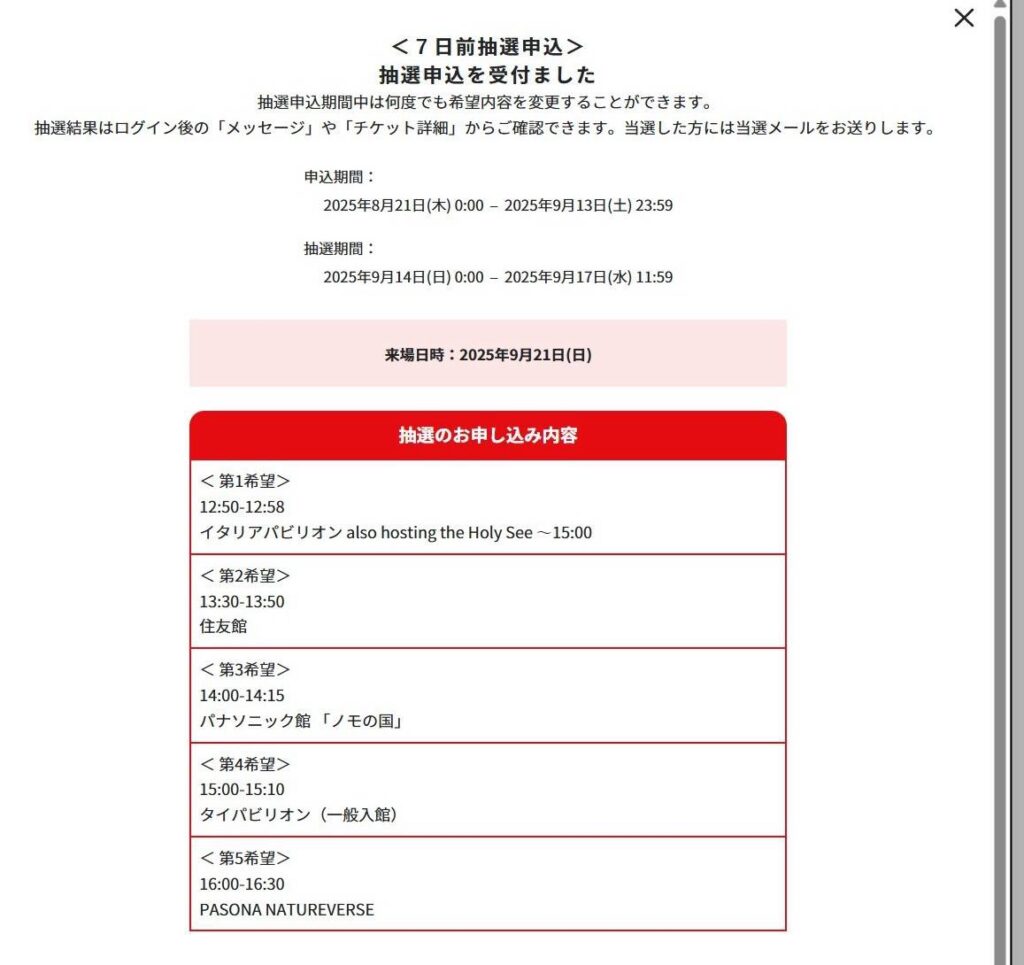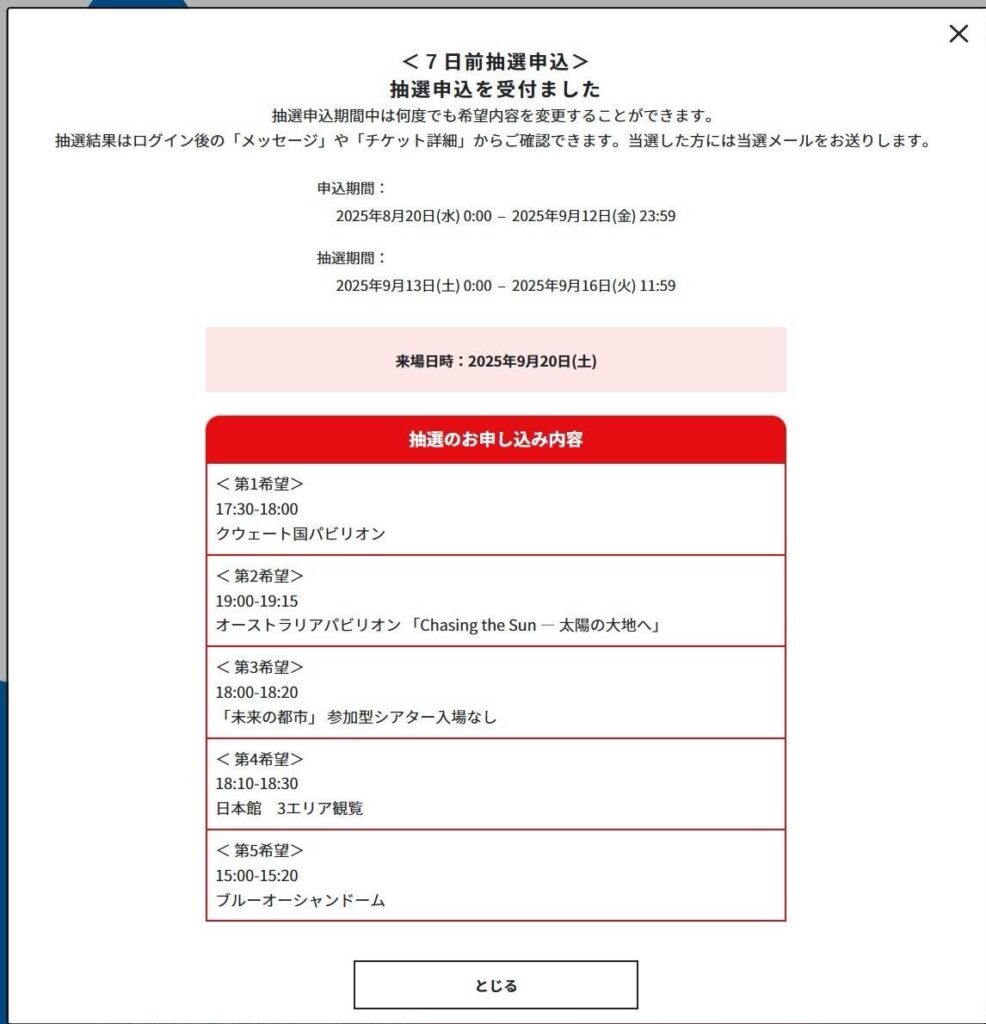 抽選の結果、土曜第3希望の「未来の都市」参加型しシアター入場なしが当選しました。最低限一つのパビリオンを確保できて安心。