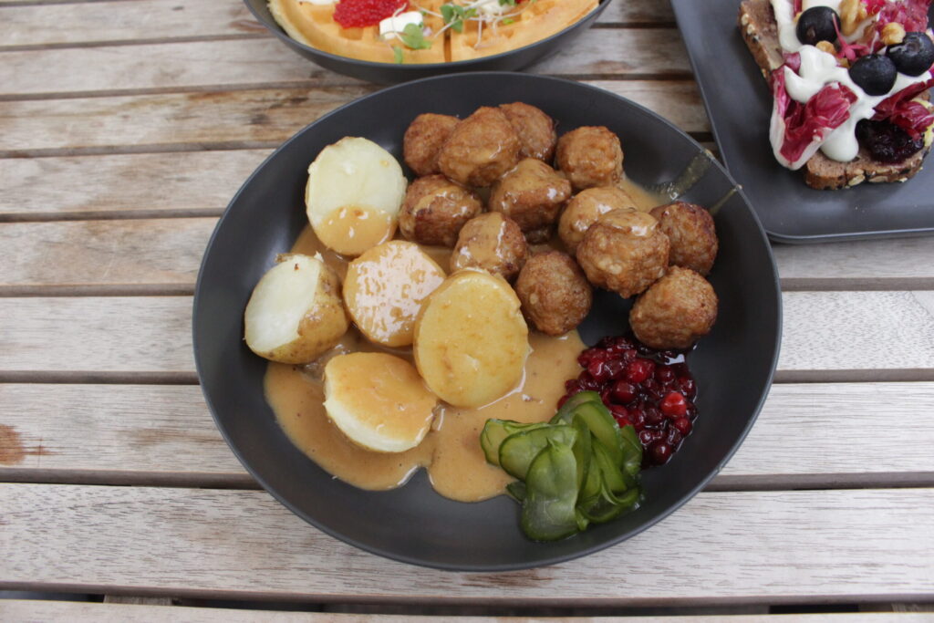 ミートボールと甘めのソースって相性いいですよね。クリームソースはコクがあってジャガイモをつけても美味しいです!添えられたリンゴンベリーも、肉とよく合っていました。
