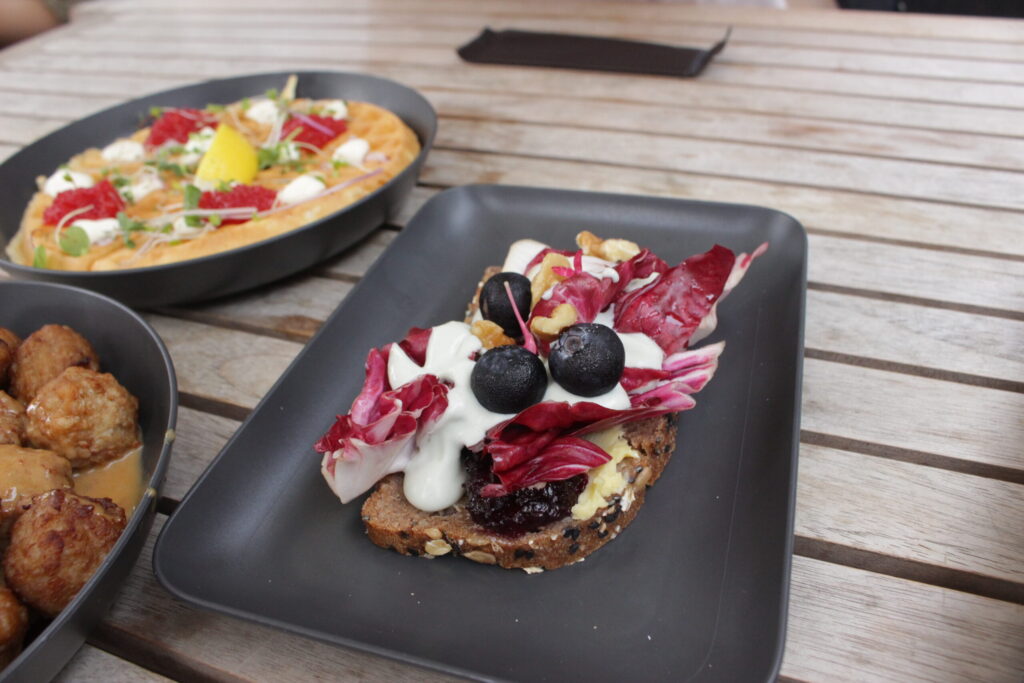 酸味のある硬めのライ麦パンの上にバター、ブルーベリージャム、ブルーチーズ、ブルーベリー、胡桃、紫キャベツが乗っていました。