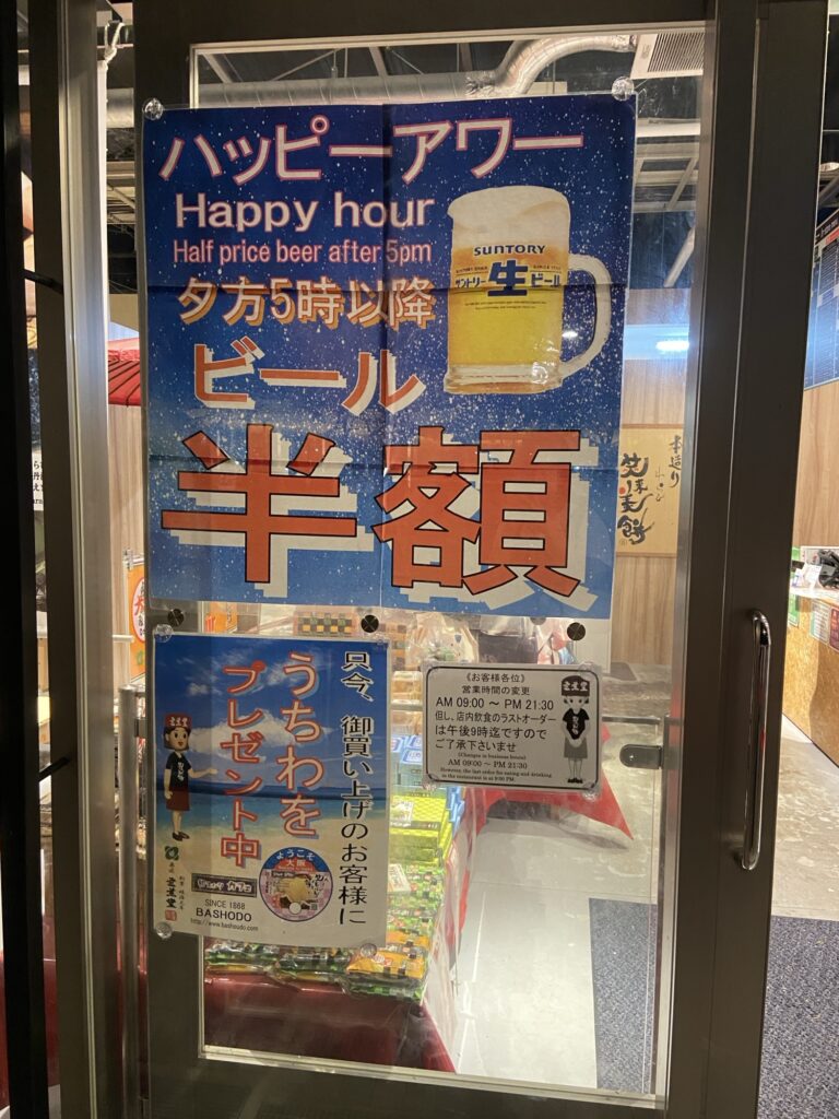 夜19時過ぎ、未来の都市から大屋根リングに戻る際のお店でビール半額の掲示を見かけました!