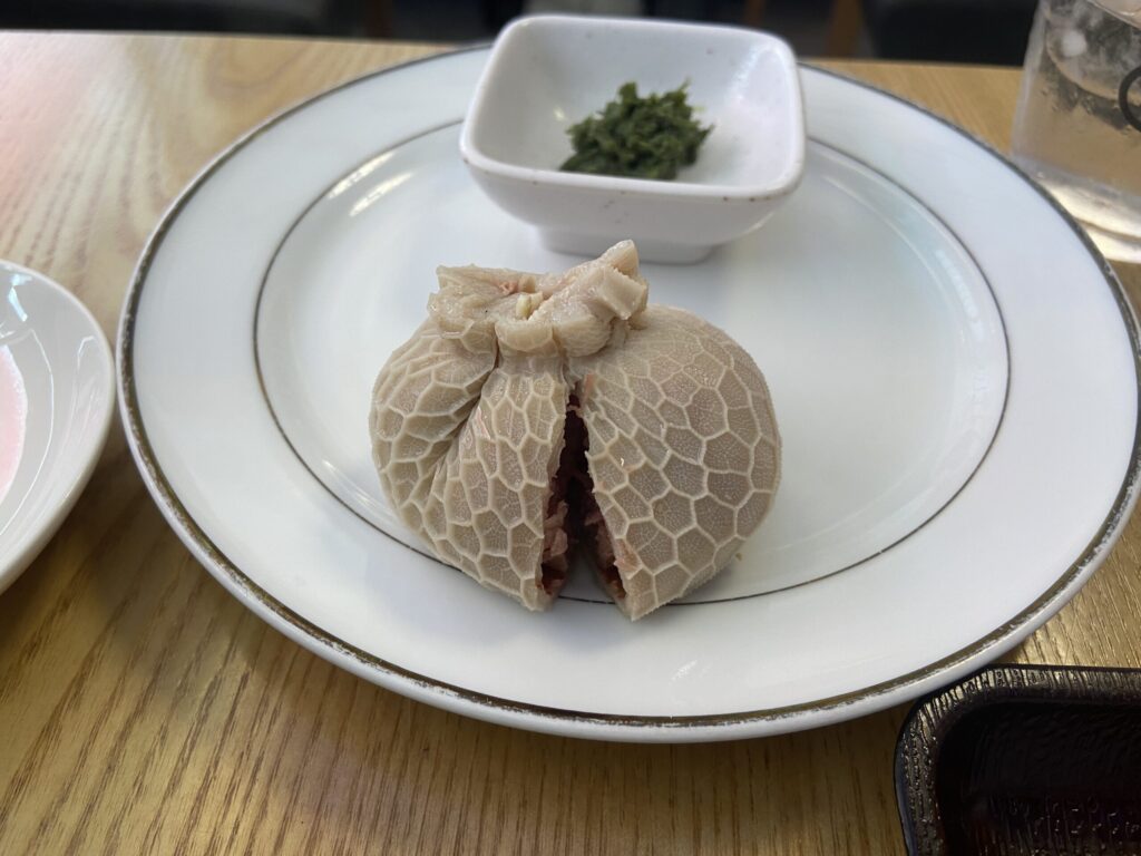 外側はハチノスのような食感、中にはゴロっとした羊肉がたっぷり。後ろにあるニラのペーストをつけて食べました。肉と合わせると口の中がさっぱりする感じで、こちらも美味しかったです。