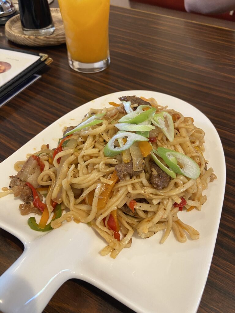 モンゴルで言う焼きうどんのツォイヴァンを期待していたのですが、これはほぼ日本の焼きうどんですね。入っているお肉は羊肉なのですが、麺は完全にうどんですし、味付けも醤油味でした。