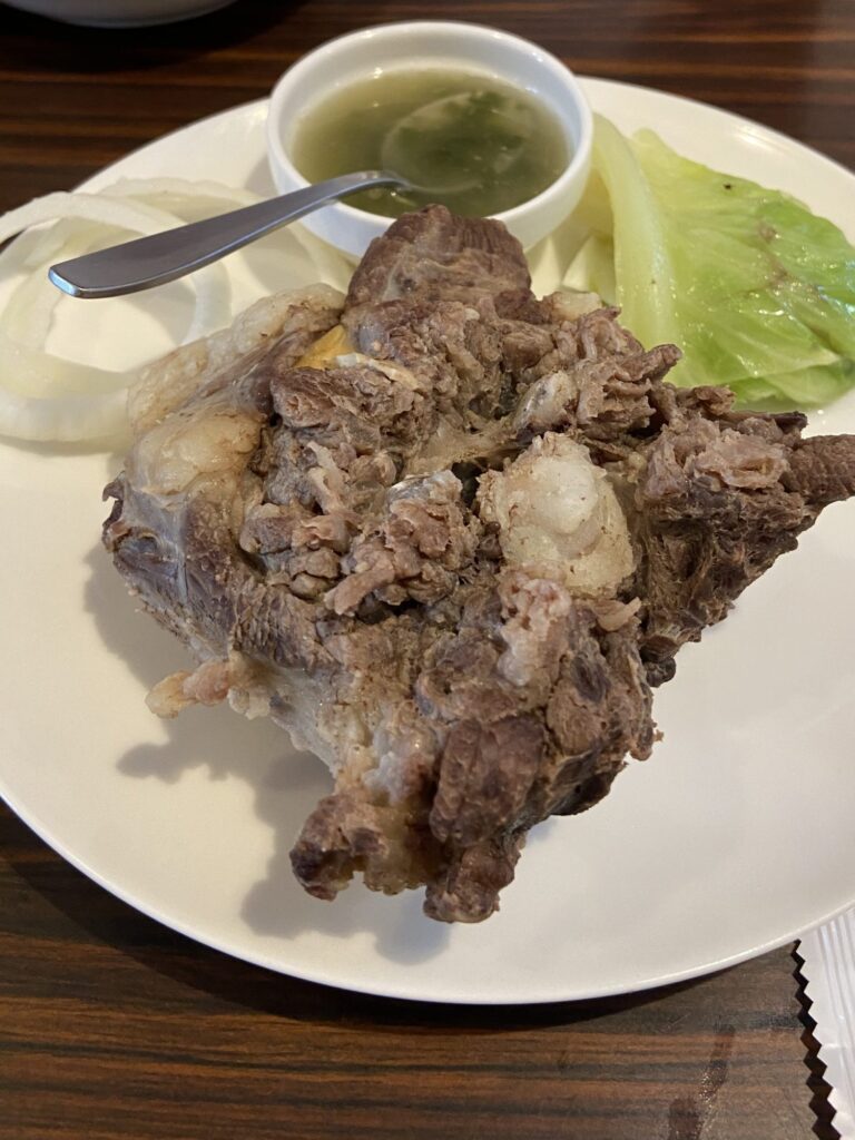 このインパクトのある見た目の料理は、骨付き塩茹で肉「チャンサンマハ」。小さいナイフで自分たちで切り分けて食べます。