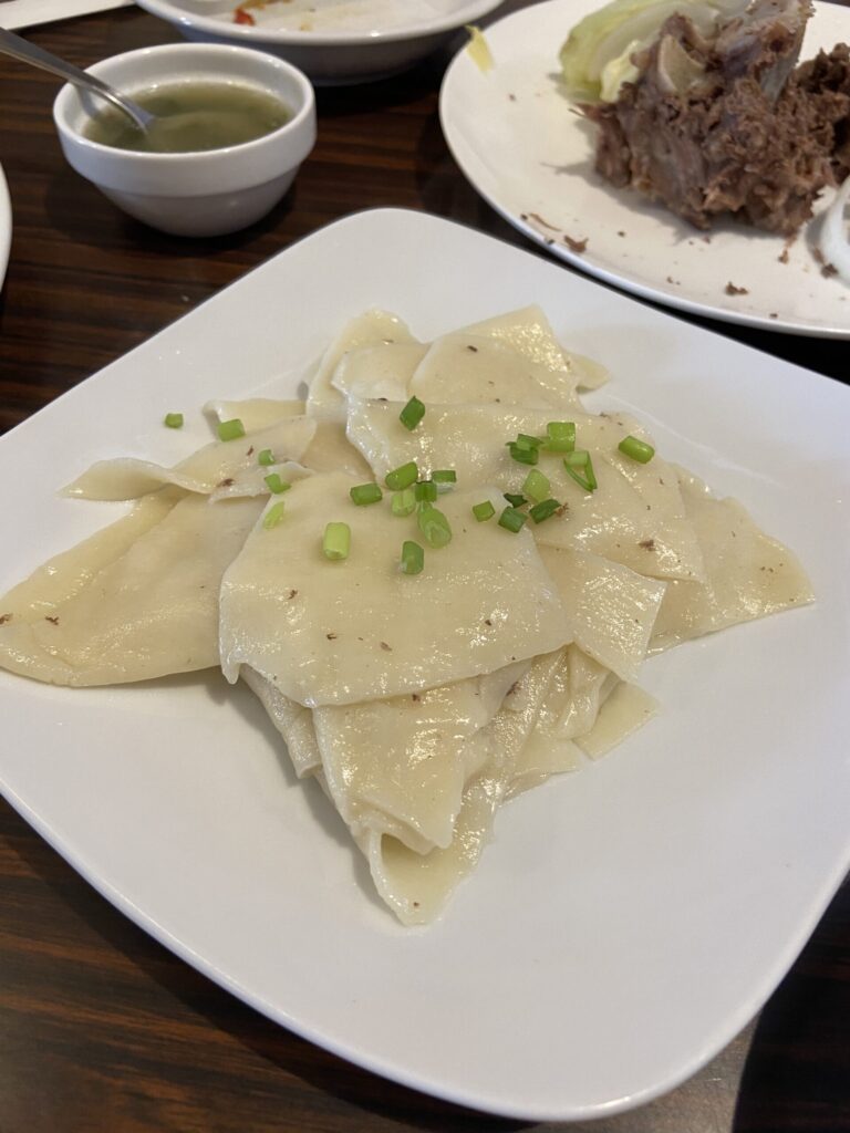 羊肉、パプリカ、にんじん、玉ねぎ、ネギなど具沢山。麺は自家製平打ち麺で、味付けは塩だけですが、野菜と羊肉の旨味も感じますし、羊肉の脂が麺に絡まりシンプルなのにすごく美味しい!見た目は日本の焼きうどんと似ていますが、味は全くの別物です。