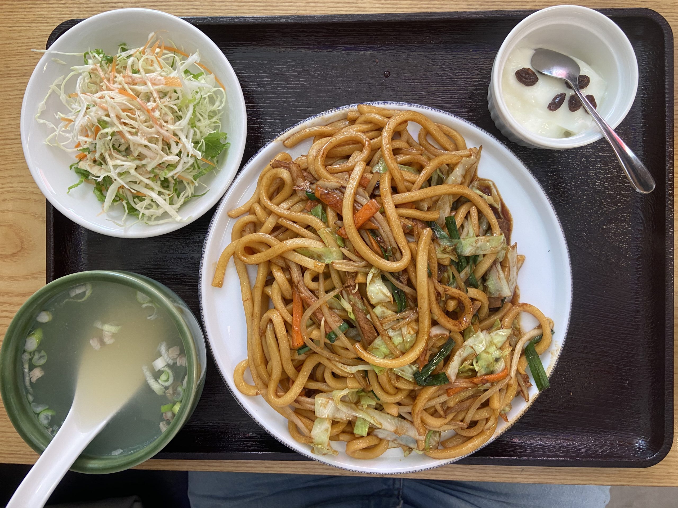 ラム肉やきうどんセット(700円):焼きうどん、羊肉のスープ、サラダ、ヨーグルトのセット。