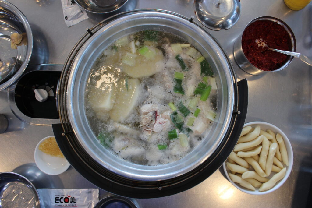 もともと入っている具材は鶏丸ごと1羽、ネギ、じゃがいものみ。お好みでネギやじゃがいもの増量、トック(餅)、締めの麺の追加をすることができます。
